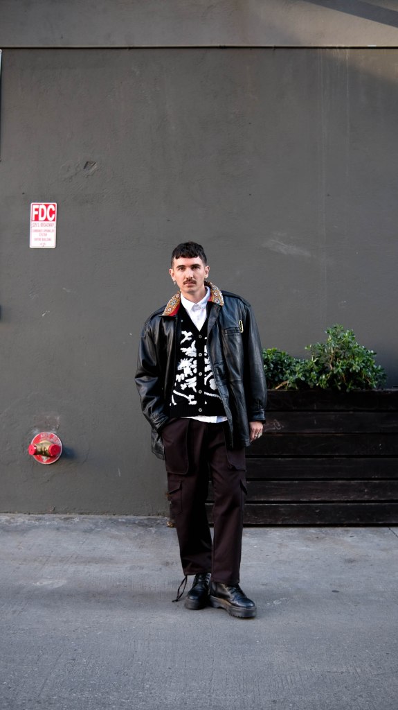 I breathe new life into forgotten pieces, weaving stories into every stitch. This leather jacket, once worn and weary, held a collar unraveling with time. I stripped away the past and adorned it with Galamkar fabric—heritage meeting rebellion. Paired with our signature cardigan and six-pocket cargo pants, this ensemble is a balance of edge and elegance. Each thread, each layer, a testament to reinvention. Find it at Far-ebar.com.